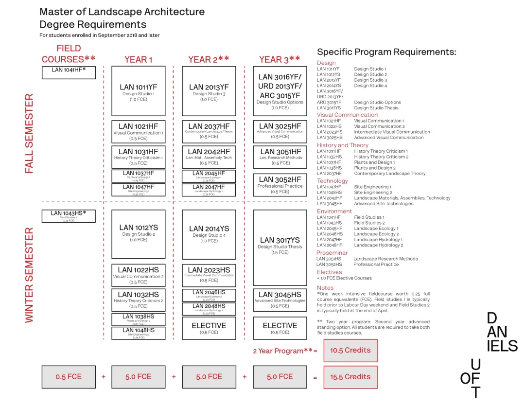 Theory(历史理论课),Technology(施工工程课),Environment(植物生态以及水文课程)几个方向。同时还有1学分的课程可以在全校范围内任意选择自己感兴趣的课程。每个学期都会配置每个方向的课程,比如Visual