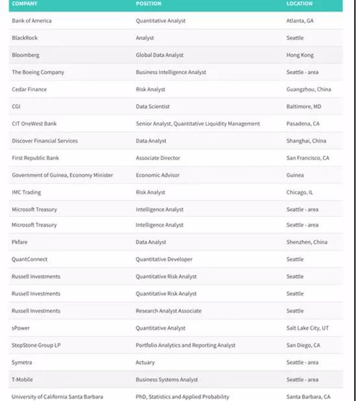 从表中可以看出,大多数的毕业生实现了在美国就业,其中大多数人就业的地点是在西雅图地区,还有少部分毕业生在加州,德州,芝加哥等地工作。