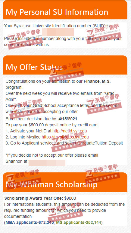 录取结果:Syracuse,MS in Finance雪城大学金融硕士录取