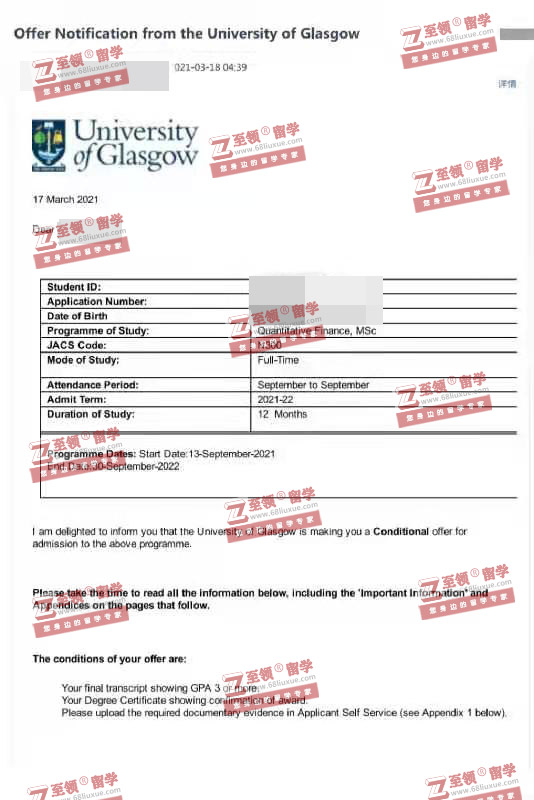 录取结果:U of Glasgow,MSC in Quantitative Finance格拉斯哥大学数理金融硕士录取