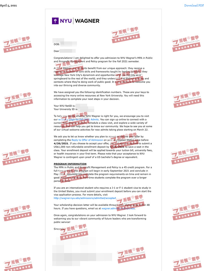 录取结果:NYU,MPA in Public and Nonprofit Management and Policy(MPA-PNP)纽约大学公共管理硕士录取