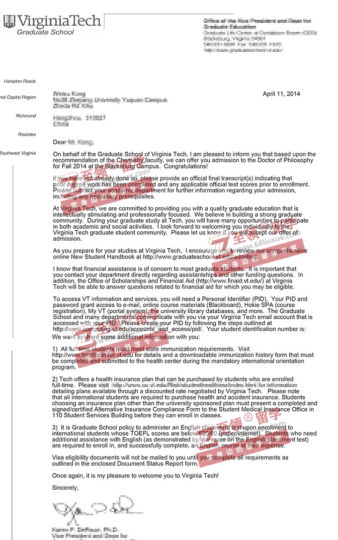 录取结果:Virginia Tech化学PHD免学费+21852美元TA