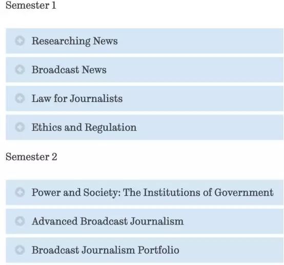 研究新闻、广播新闻、记者法、道德与监管、广播新闻组合等。