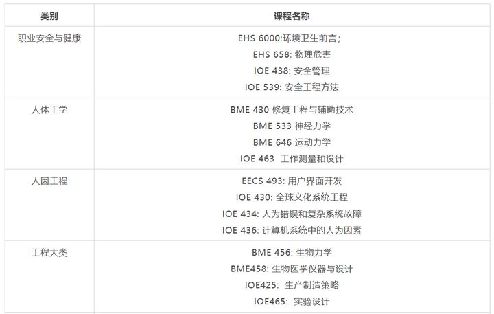 Ergonomics,OSE)这一方向的学生可以从职业健康与安全,人体工学,认知人机工程学(人因工程),工程大类,管理和科研6个模块中选择感兴趣的课程学生可以根据校方提供的课程清单,选择自己感兴趣的内容来满足课程模块要求。