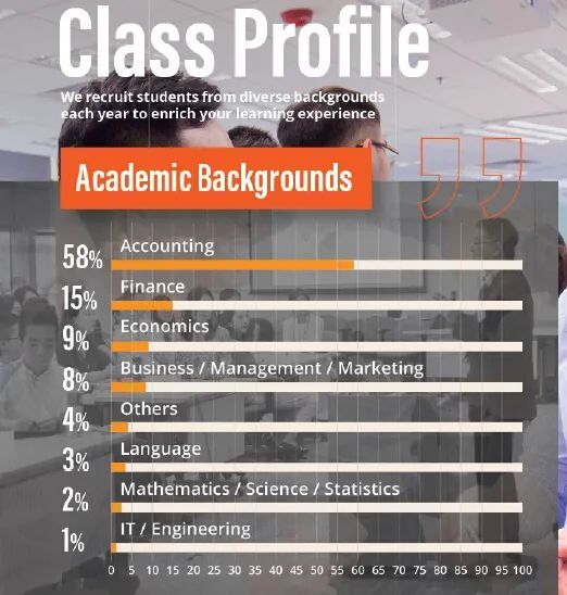 从上图我们可以看到:58%的同学是会计专业背景,其次是金融背景(占15%),经济学背景(9%),商业/管理/营销专业背景占8%,其他和语言类背景占7%,理工科背景仅3%。虽然官网说不限专业背景,但从上面的数据可以看出,港大会计硕士还是倾向于会计、经济学等商科背景的学生。