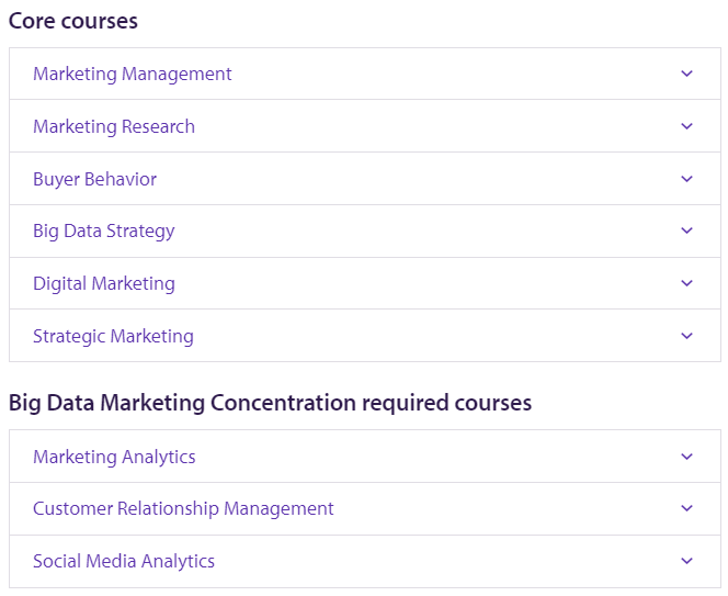 Marketing(大数据营销)。共需要修36个学分,包括9门核心课程和3门选修课程。具体课程设置如下: