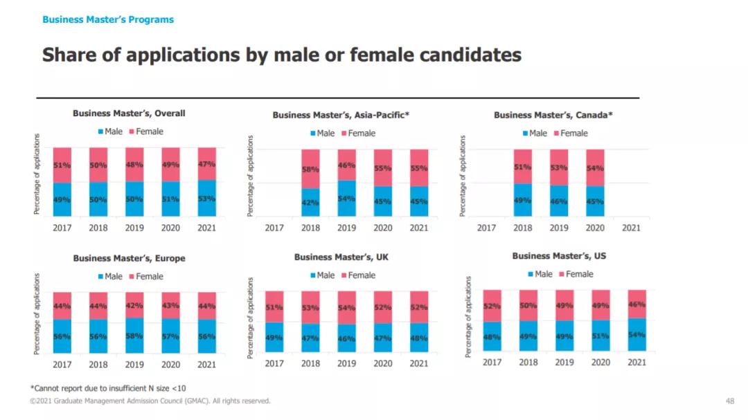 从2021年商科硕士项目申请数据来看,男性占比为53%,女性占比为47%。按国家和地区来看,英国和亚太地区的商科硕士项目有更多女性申请,而欧洲和美国的商科硕士项目则有更多男性青睐。
