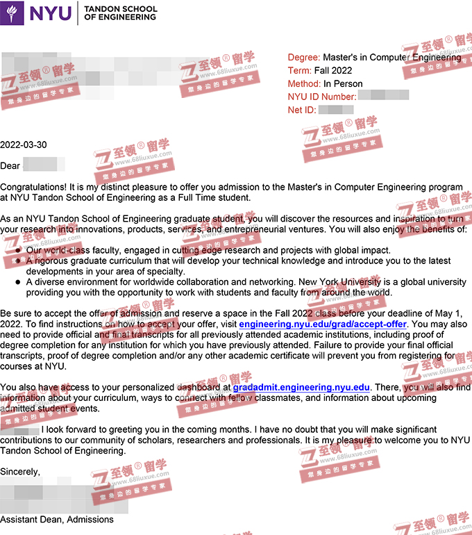 录取结果:NYU,Master's in Computer Engineering 纽约大学计算机工程硕士录取