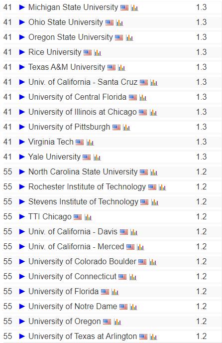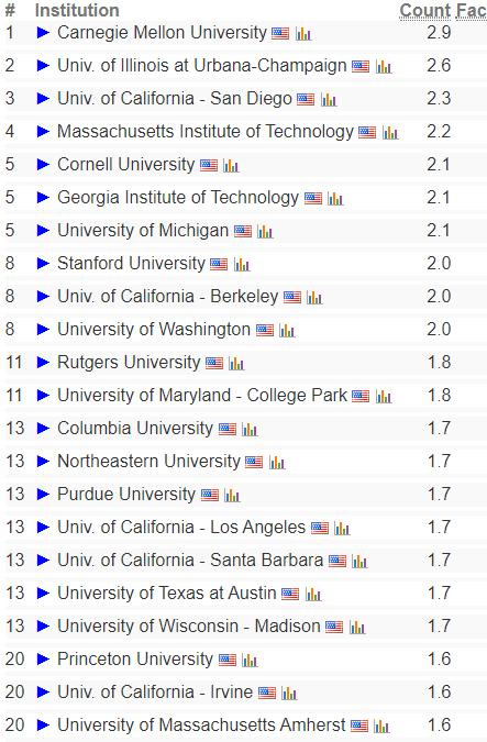同时,也有几所在US.News美国大学排名不是很高的公立大学在计算机领域表现突出,甚至超越了麻省理工、芝加哥大学、哥大和耶鲁等藤校。