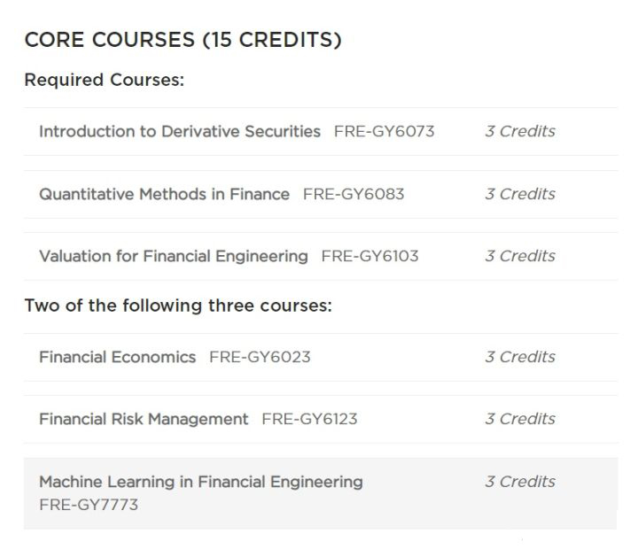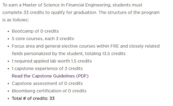 项目学制为4学期制,学生需要修满33个学分,其中有15学分的核心课程,核心课程如Introduction to Derivative