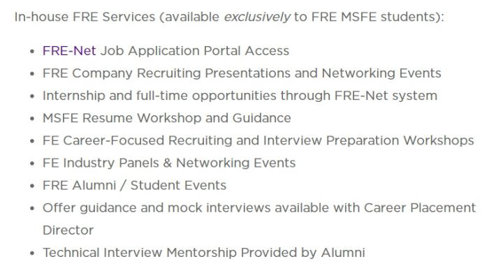 Center提供的资源外,MSFE学生还可以通过内部的FRE系提供的就业资源获得就业支持。如FRE校友联谊活动、简历指导和模拟面试。FRE就业指导主任给学生提供了一对一的就业指导,帮助他们找到满意的工作。另外,还有每周与业界人士一起举办的研讨会等等,所以申请到这个项目完全不用担心就业问题。