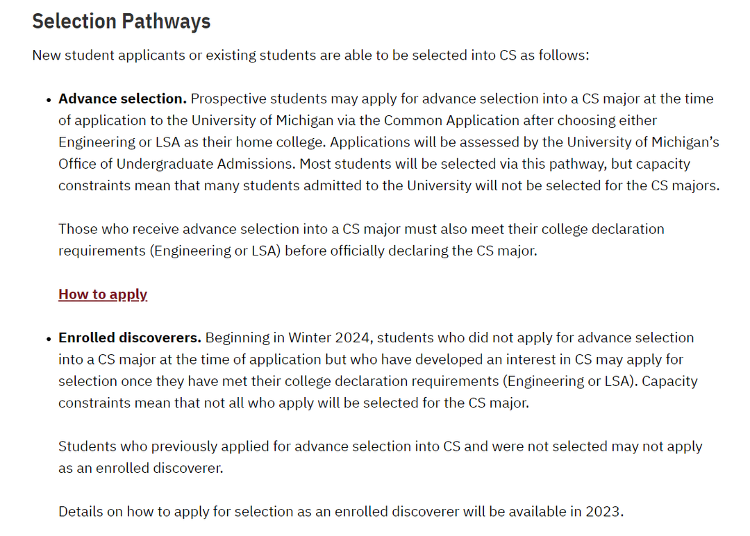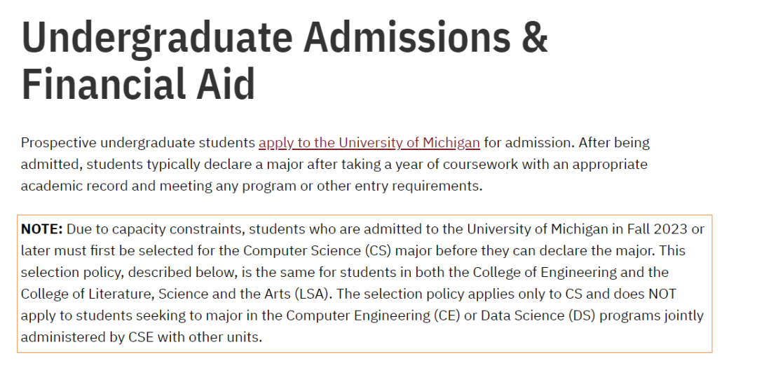 2023年秋季或之后被密歇根大学录取的学生必须先被选为计算机科学(CS)专业,然后才能申报该专业。(密歇根大学的学生一般在完成一年的本科课程后,并取得相应的学业成绩以及满足特定的条件,才会正式申报一个主修专业)。 这一重大变化将影响很多希望通过文理学院录取密歇根大学,之后再转入计算机专业的学生。