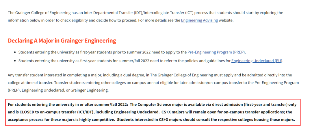 UIUC工程学院宣布:从2022夏季和秋季学期开始,不接受校内学生转到工程学院的CS专业!