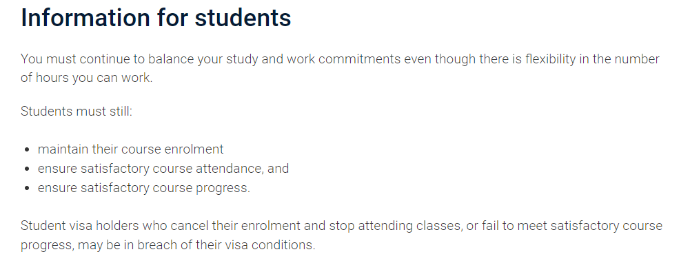 即使在2023年6月30日之前,学生签证持有者打工时长无限制。但是,同学们也需要确保自己遵守澳洲移民局针对学生签证的具体规定: