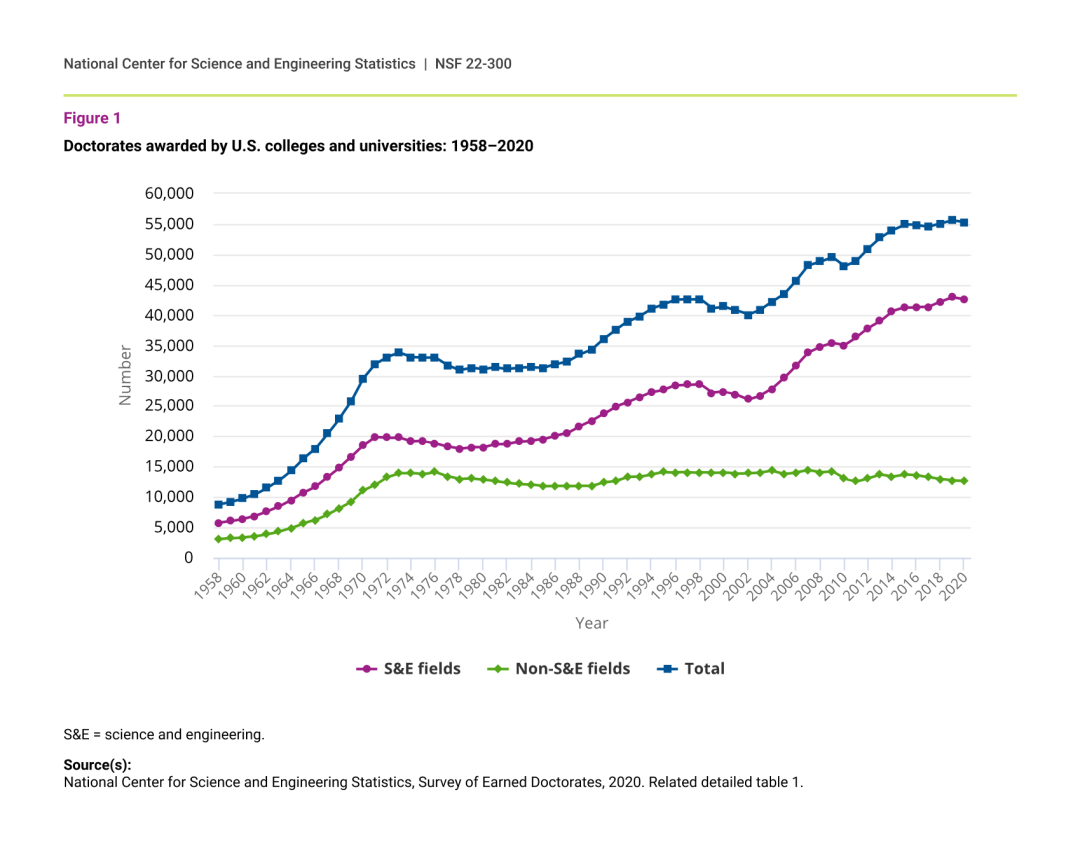科学与工程(S&E)领域授予的研究博士学位数量已经超过了非S&E博士学位的数量,差距已经扩大。