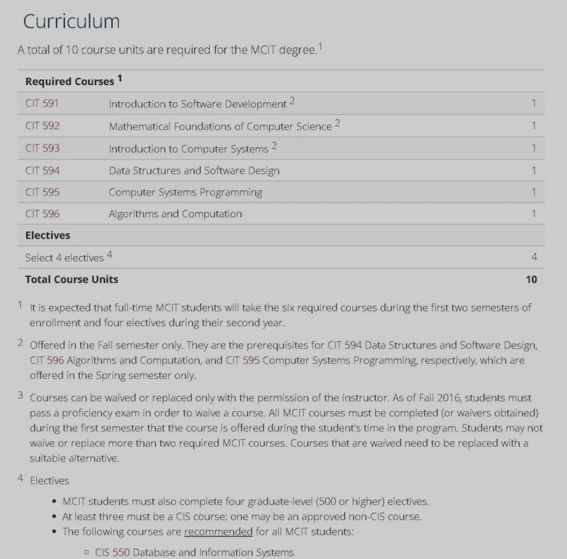 MCIT项目总共开设了10门共30学分的课程,为期两年(最多允许在7年内完成学位课程,学生GPA必须达到2.7才能准许毕业)。全日制学生在入学的前两个学期修读6门必修课,并在第二学年修读4门选修课。