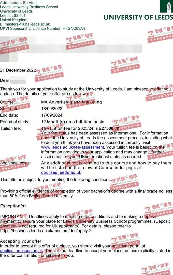录取结果: Leeds University,MA, Advertising and Marketing 利兹大学广告与市场营销硕士录取