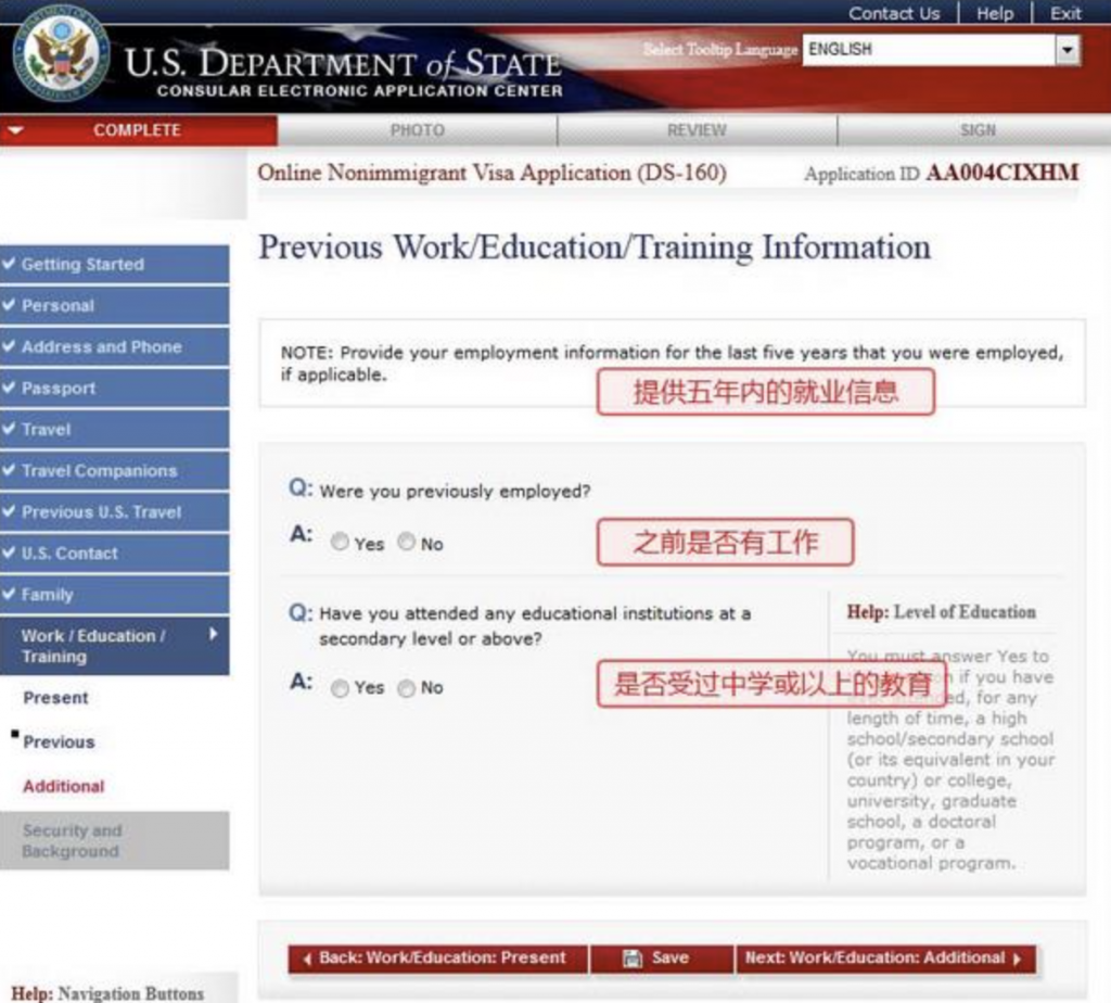 DS160表中的Previous Work/Education/Training Information 以往工作/教育/培训信息,申请人须提供以往五年内的工作信息和中学以上的教育经历,如图: