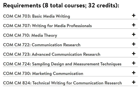 该项目开设在BU的传播学院,3个学期,12门课程(8必修+4选修),48学分,STEM-designated。小班授课,每年入读人数在25-30人。该课程旨在为学生提供高级研究方法的指导,以获得消费者洞察、预测购买行为、评估媒体消费的影响,并分析消费者对品牌、服务、产品等的决策过程。而学生们将会掌握定量和定性的方法、工具以及技术,以便更好的理解受众的价值观、喜好、需求和愿望,并将这种理解和沟通策略去相匹配。