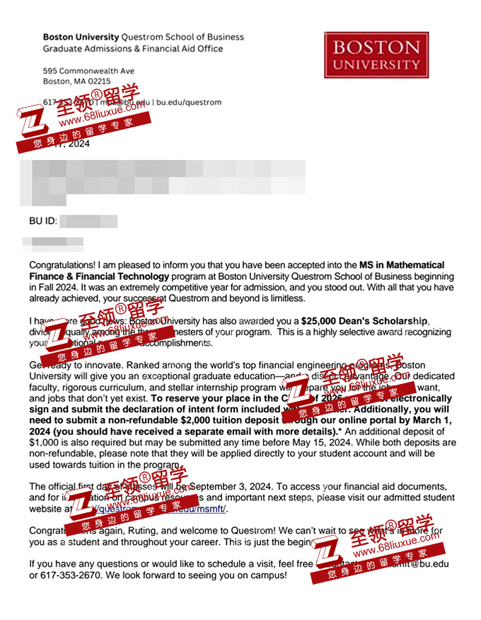 录取结果:Boston University,MS in Mathematical Finance & Financial Technology波士顿大学金融数学硕士录取