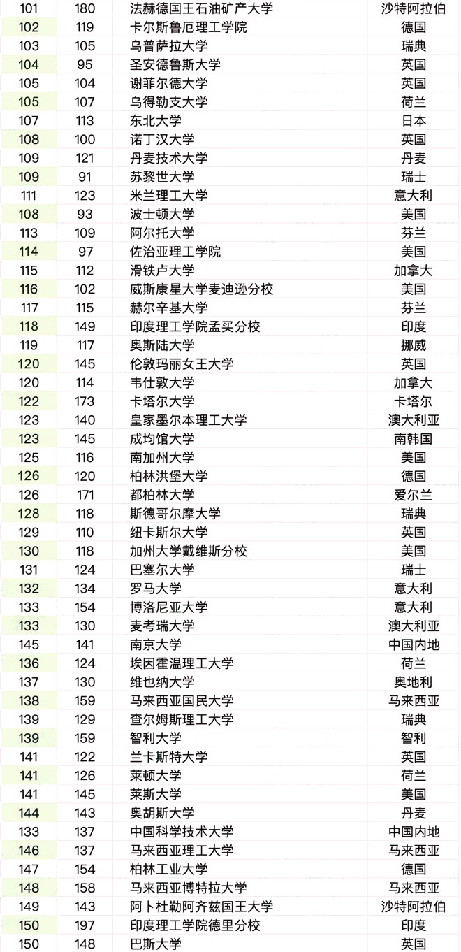 英国高校展示出多样化的态势,帝国理工的显著提升成为亮点,牛津、剑桥和伦敦大学学院同样稳固前十地位,彰显英国教育的深厚基础。不过,爱丁堡、曼彻斯特等知名学府排名下滑,布里斯托、伯明翰等则有所进步。谢菲尔德和圣安德鲁斯未进前百,排名并列105。