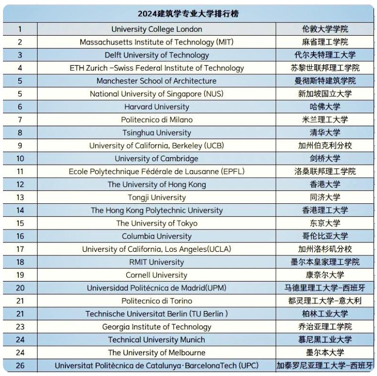 值得一提的是,巴特莱特建筑学院、麻省理工学院和代尔夫特理工大学在前三名中保持了他们的排名,而苏黎世联邦理工学院的排名有所下降。同时,米兰理工大学在排名上取得了显著的进步,从去年的第十位上升至第七位。这一排名无疑为全球建筑学专业的学生和教师提供了宝贵的参考!