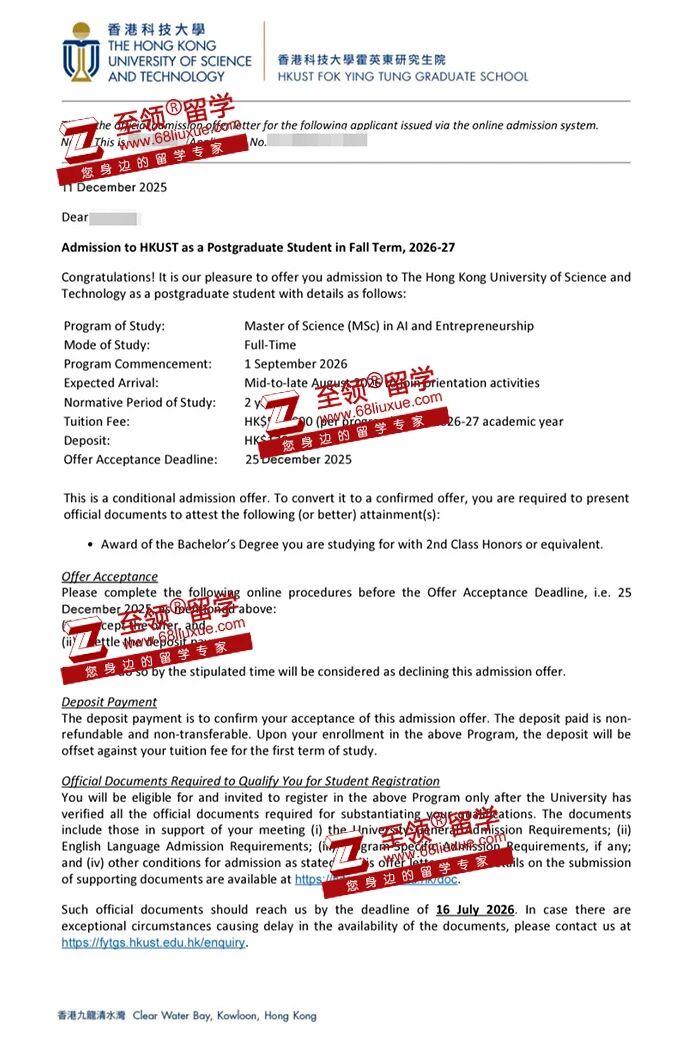 录取结果:香港科技大学,人工智能与创业硕士录取