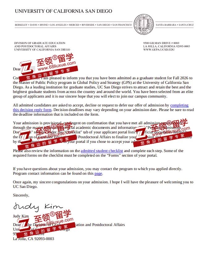 最终,凭借精准的定位与差异化的文书呈现,W同学成功获得UCSD录取。