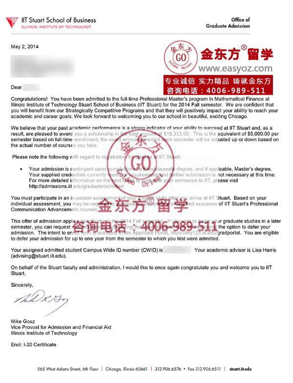 录取结果:IIT Master of Mathematical Finance+$18,333.00奖学金