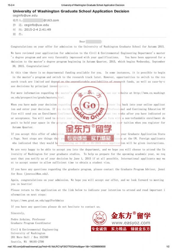 录取结果:University of Washington-Civil & Environmental Engineering (2015年专排17)硕士