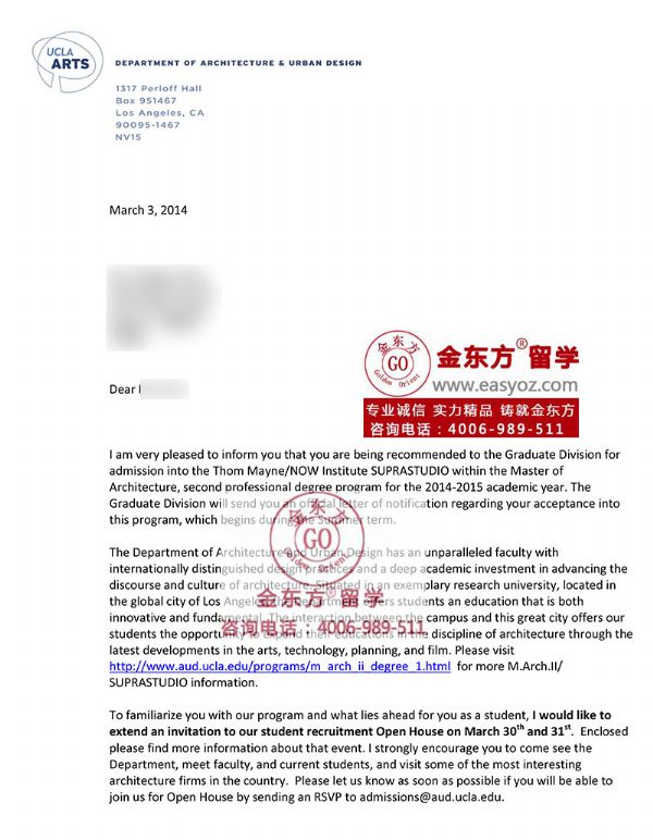 在UCLA建筑学硕士录取中,汤姆梅恩工作室 (Thom Mayne Studio)的申请难度是最高的,不仅仅因为汤姆梅恩是世界知名的美国建筑师,更因其获得2005年建筑学最高荣誉普利策大奖得主。H同学的作品集能够获得UCLA Thom Mayne大师的认可,获得该工作室录取,不仅仅证明了H同学在建筑学深厚的功底,同时充分证明了我公司对于建筑学作品集指导的专业水平。