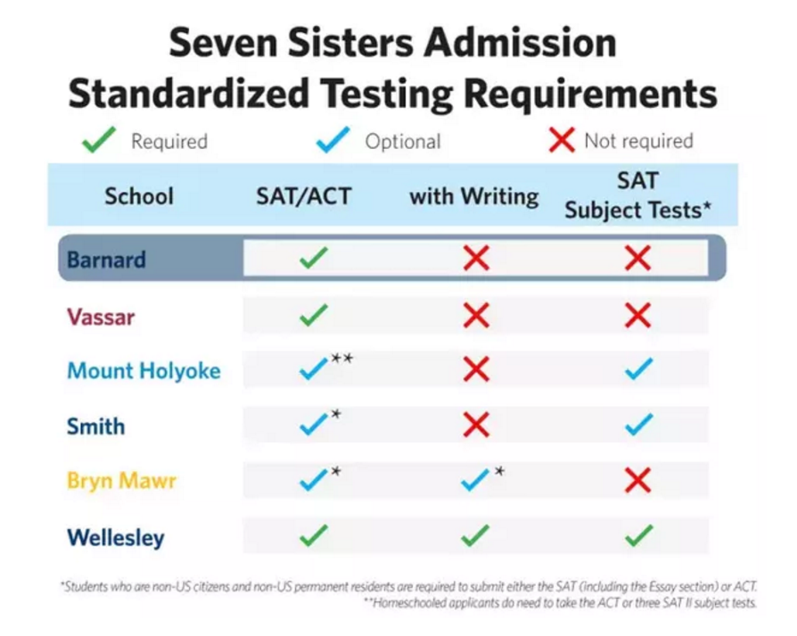 作为美国七姐妹学院之一,巴纳德学院是第四所明确表示不需要提交SAT写作成绩及SAT Subject Test成绩的学校。其他姊妹学校的关于SAT要求如下: