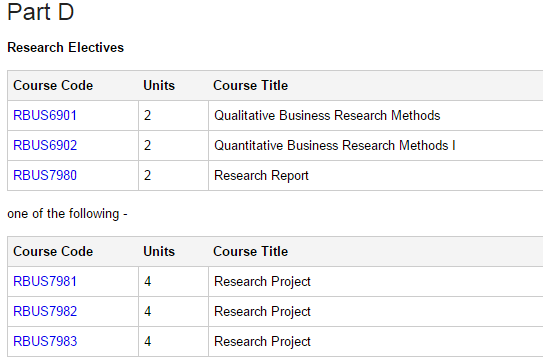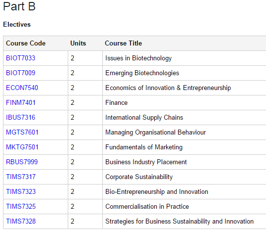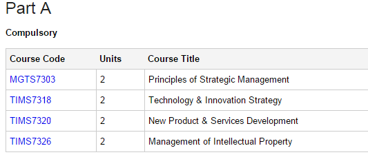 昆士兰大学技术与创新管理硕士(Master of Technology and Innovation Management)学制为1.5年,学生共需修完24个学分(unit)的课程。其中,8个学分为必修课(Part A);12个学分,学生需要从选修课(Part B),或者,细分专业课(Part C)中选择;另外4个学分,学生可从Part B和Part D中选择。