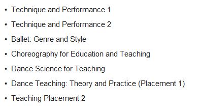 在本科第一年,学院着重训练学生的舞蹈能力和舞蹈技巧,为未来的舞蹈表演打下扎实的基础,在课程的设置里我们可以看出,舞蹈的技巧训练、运动科学、身体的知识、舞蹈的分析等占了重要的部分。同时,在舞蹈教学方面提供了一些入门级的课程,比如Introduction to dance teaching。在第一年,学校还将组织学生去观摩舞蹈学校的教学课,参加相关的舞蹈项目,并且去舞蹈团进行教学法学习,理论和实践上都有一定的覆盖。