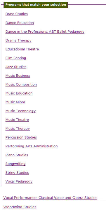 The Master of Music program in Vocal Performance with a specialization in Classical Voice:该项目开设了密集型的训练课程,旨在将学生培养为领域内有着较高艺术涵养以及专业修养的人才。不管是private lessons,master class,lecture class还是studio/workshop classes,任课教授们在该领域享有较高的声誉, 并且都有着非常丰富的高水准表演经历,能够为学生的专业学校带来跟多有实际意义的指导。该项目共36个学分。