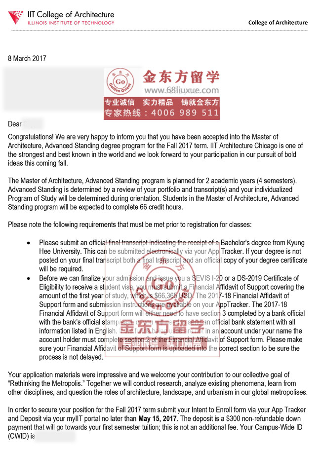 录取结果:伊利诺伊理工学院,建筑学硕士Master of Architecture, Advanced Standing program 项目录取