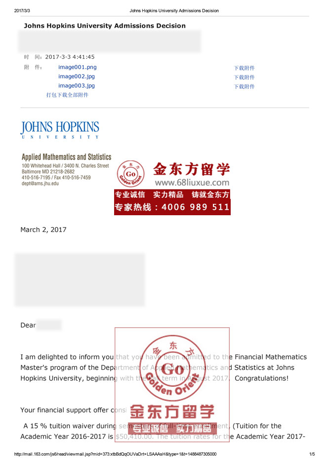录取结果:John Hopkins University (约翰霍普金斯大学),Financial Mathematics Master's program (金融数学硕士),+15%减免学费