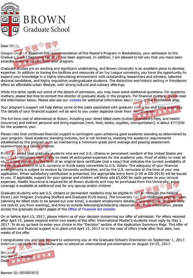 录取结果:布朗大学,生物统计硕士,有一部分奖学金学校没有明确说是多少