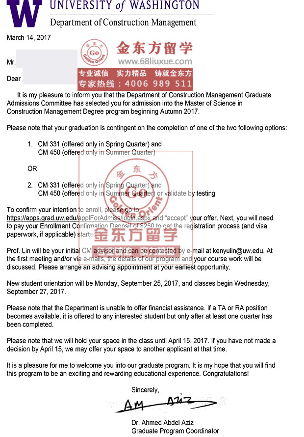 录取结果:University of Washington(华盛顿大学),Master of Science in Construction Management 建筑工程管理硕士