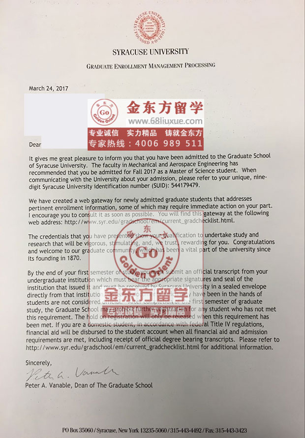 录取结果:Syracuse University(雪城大学),Master of Science in Mechanical and Aerospace Engineering (机械与航空航天工程硕士)
