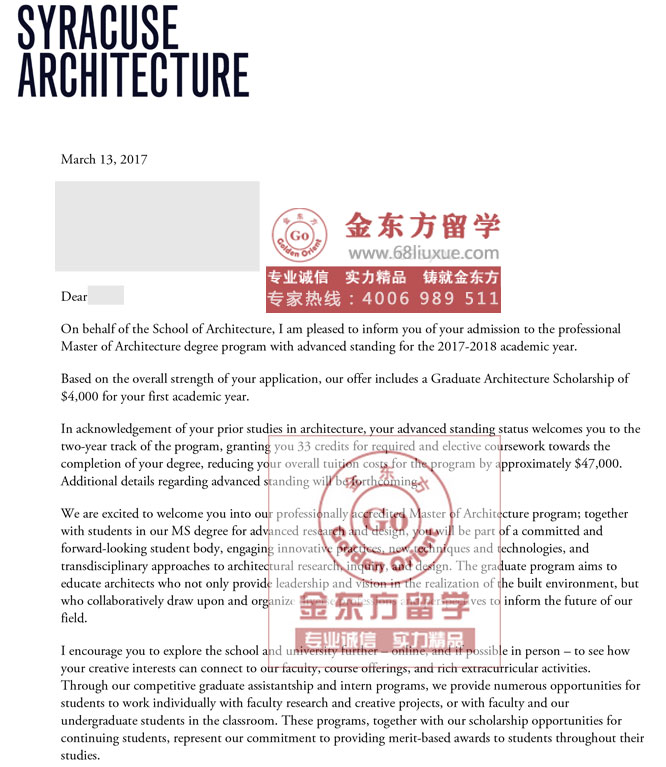 录取结果:雪城大学,建筑学硕士,奖学金$4,000