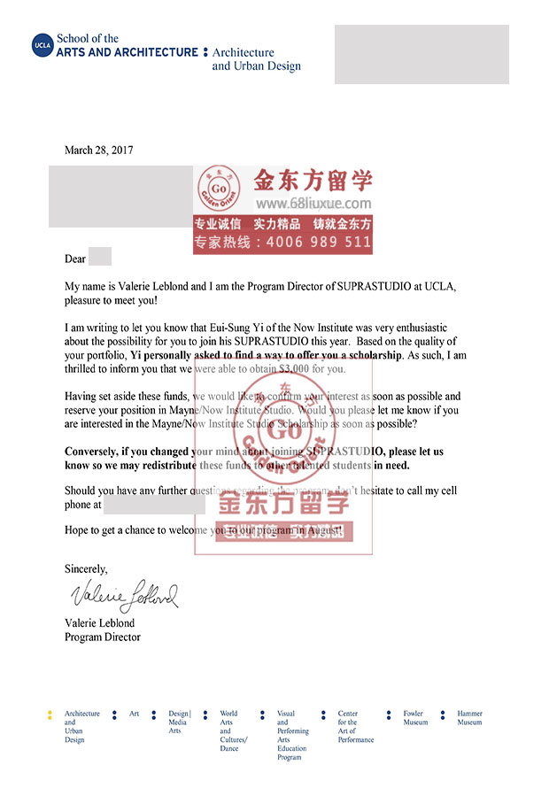 录取结果:UCLA-Mayne/Now Institute Studio加州大学洛杉矶分校-汤姆·梅恩工作室,奖学金$3000