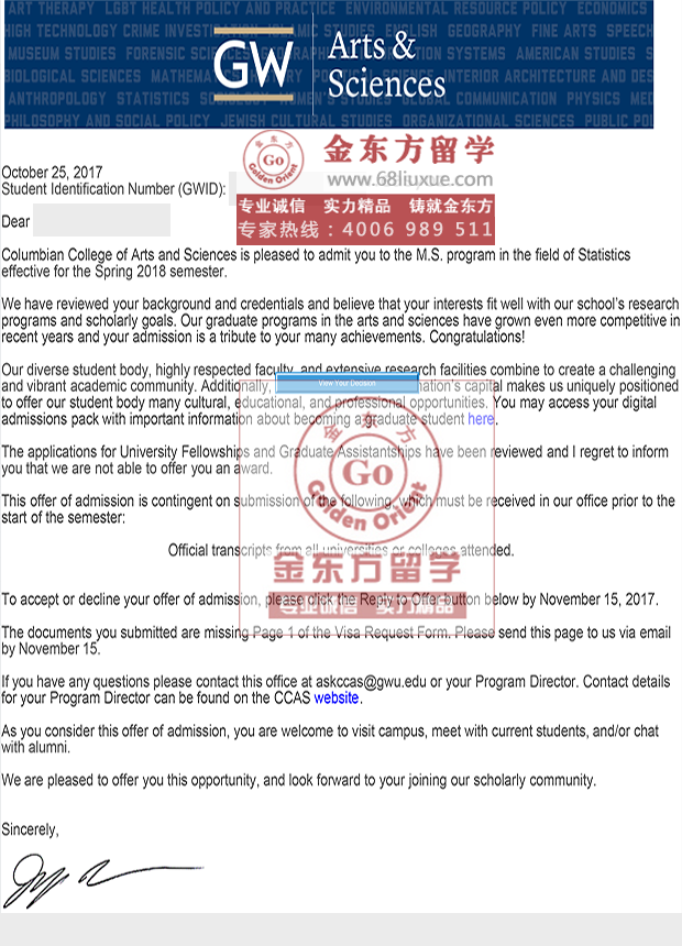 录取结果:The George Washington University乔治华盛顿大学, MS in Statistics 统计学硕士
