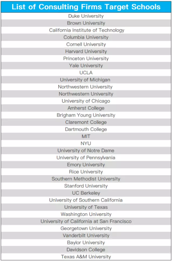 这并不代表咨询公司没有Target School情结,在Target School中,一般有专门培训咨询求职方向的Consulting Club,针对性地帮助来自这些学校的学生求职咨询工作。比如以下学校毕业的同学,就有很大的机会能进MBB: