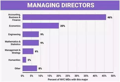 6、在华尔街金字塔顶尖的董事总经理级别,有46%是会计、商务和金融专业,20%是经济学专业,9%是工程专业。