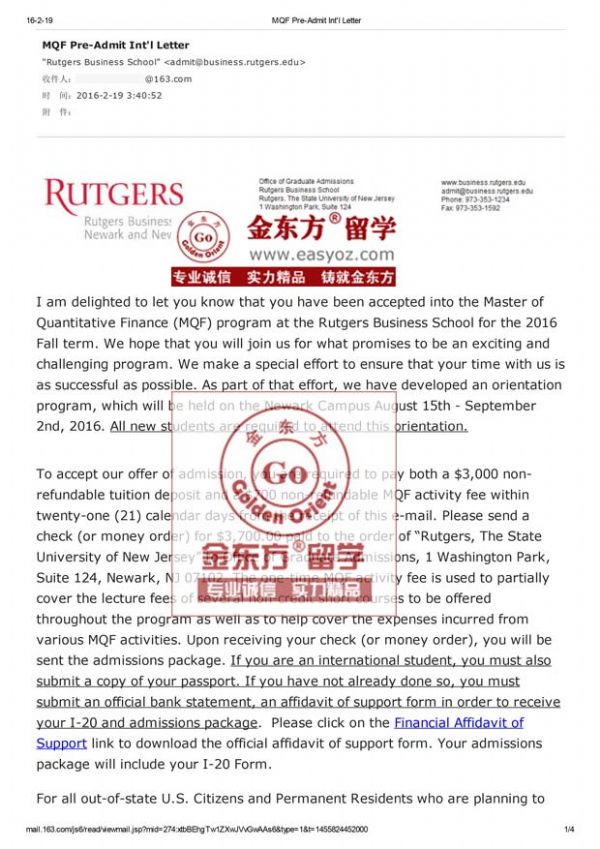 申请材料交上去两个月后,李同学收到了罗格斯大学计量金融硕士的录取通知书,并且学校答应第一年给12000刀的奖学金,知道这个结果时,李同学激动地不得了。