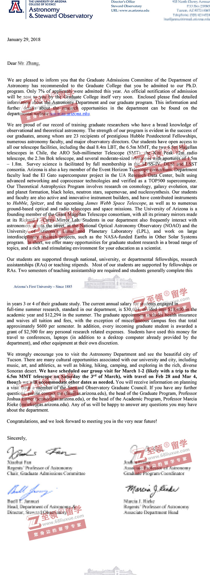 录取结果:The University of Arizona亚利桑那大学, Ph.D in Astronomy and Astrophysics 天文和天体物理学博士全奖录取 (免学费+ $34,394 /年补助)