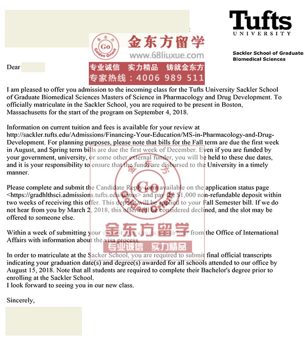录取结果:Tufts University,Sackler School of Graduate Biomedical Sciences 塔夫斯大学生物医学学院,Masters of Science in Pharmacology and Drug Development药理学与药物开发硕士