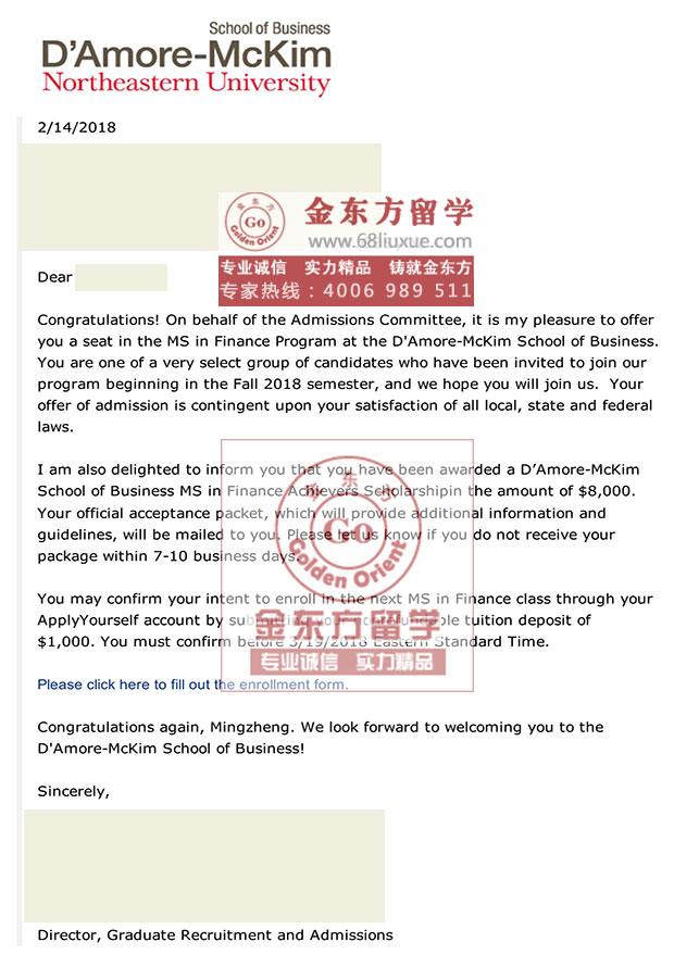 录取结果:Northeastern University东北大学,Masters in Finance 金融硕士,奖学金$8,000
