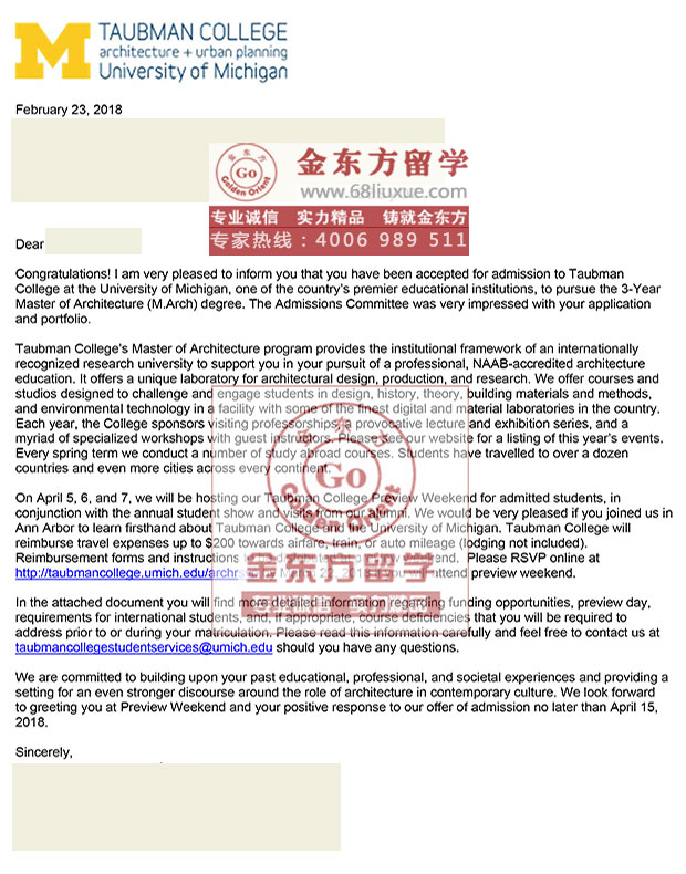 录取结果:University of Michigan密歇根大学,Master of Architecture (M.Arch)建筑学硕士